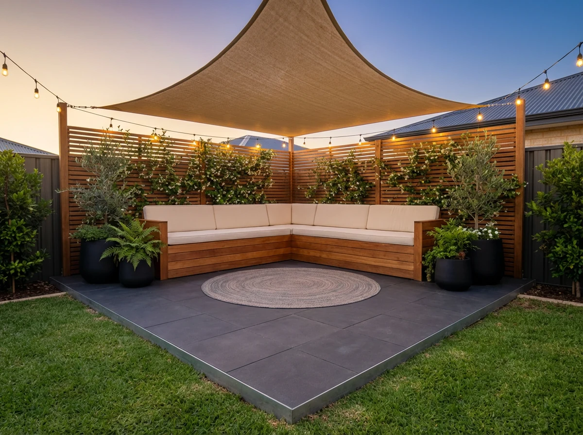 An L-bench locks your layout and removes chair sprawl. Add hidden storage under the seats for cushions, citronella, and a throw blanket. IMO, a built-in bench solves 80% of small-patio chaos.