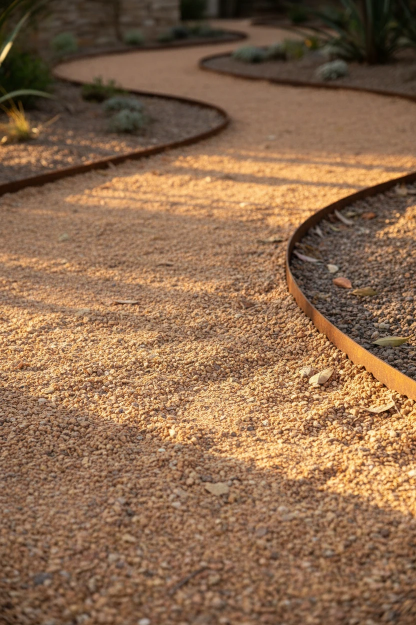 closeup of warm-toned decomposed granite path with steel edging