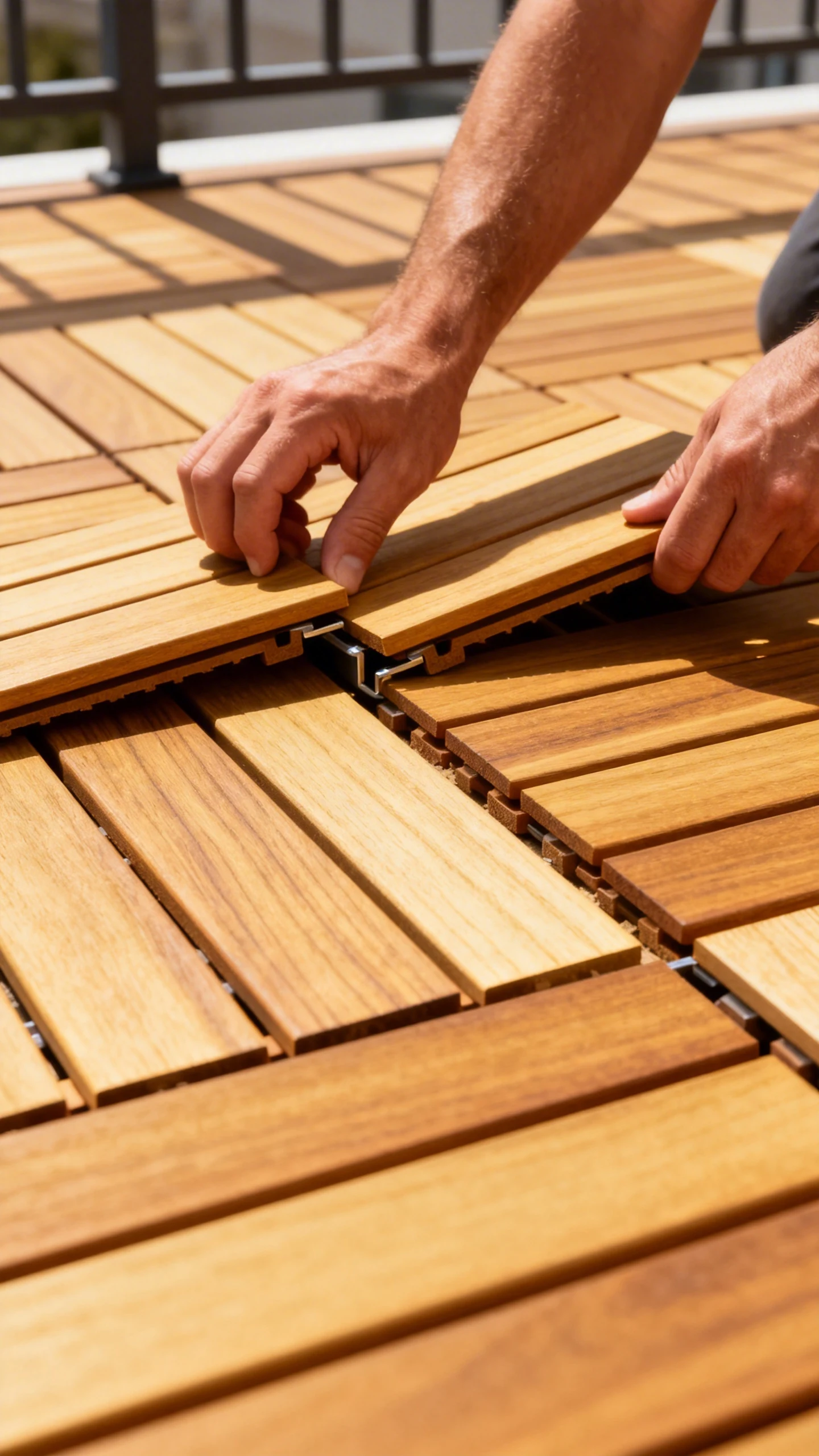 Snap-together deck tiles give you quick visual warmth. You can also use outdoor rugs to soften the look and make seating areas feel “room-like.”