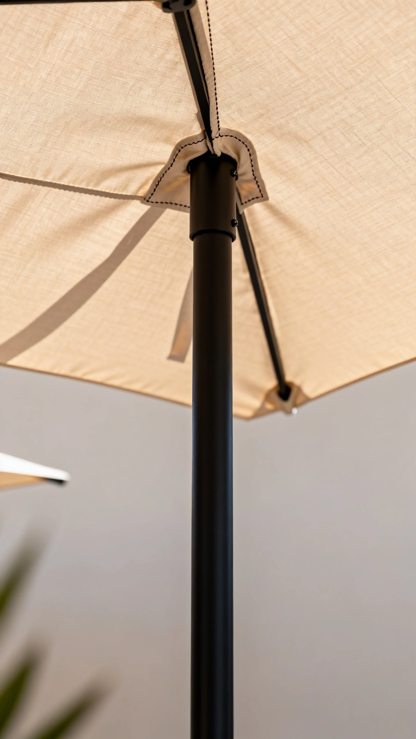 A big patio umbrella works, but choose one with a clean shape and a neutral color. Cantilever umbrellas free up floor space and keep things feeling open.
