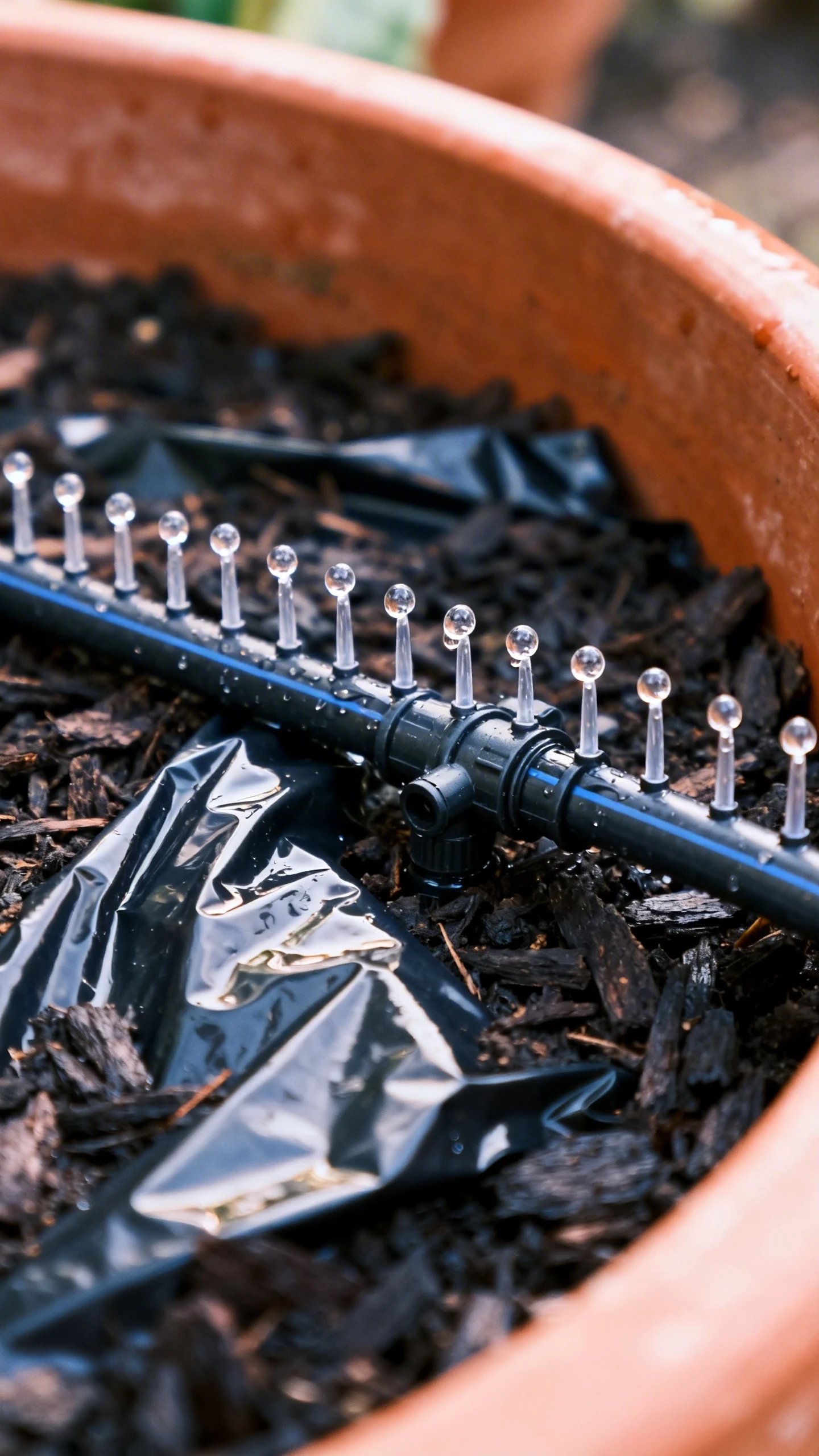 Add mulch on top of soil to reduce evaporation and keep things tidy.