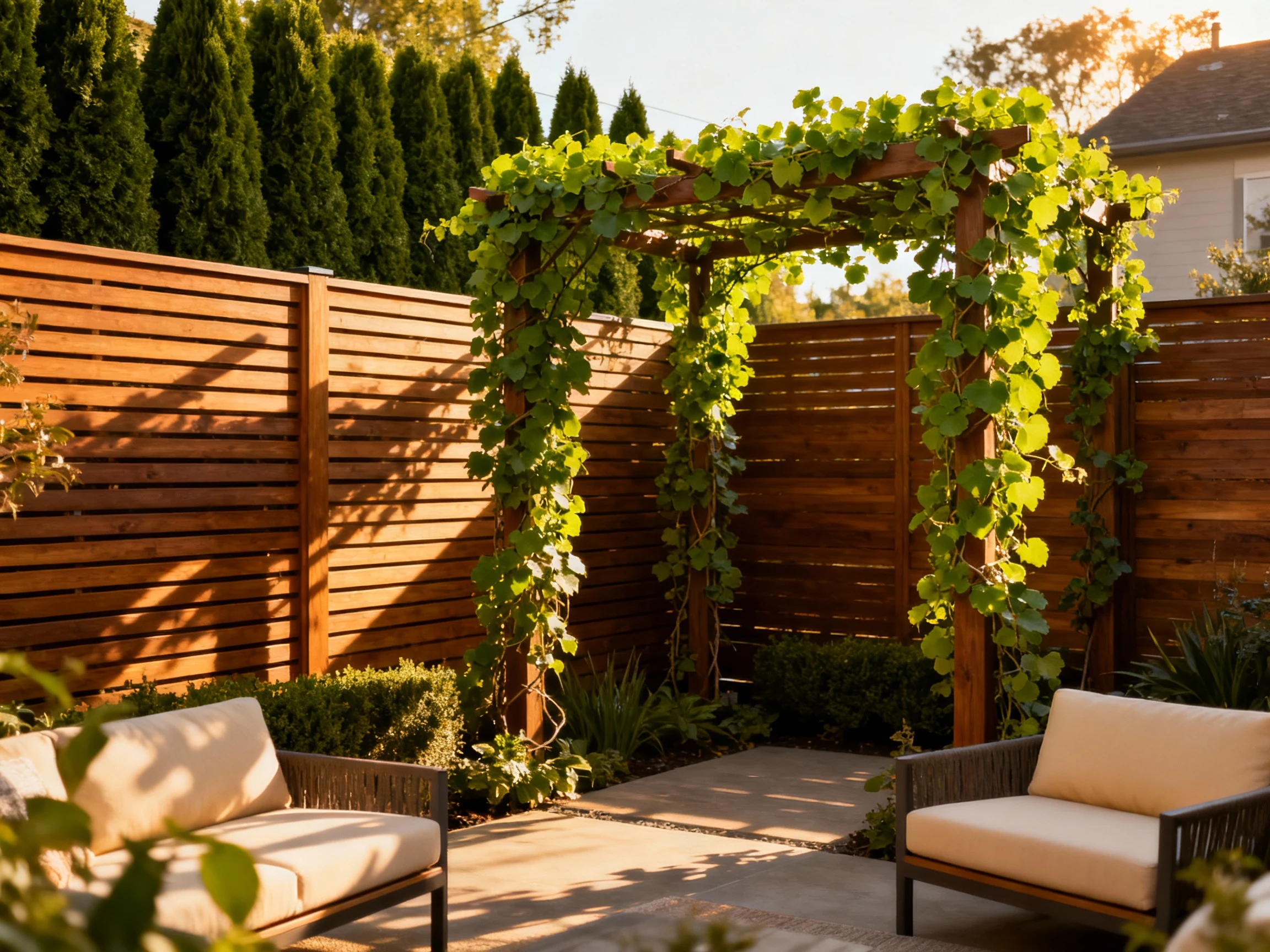 Layer heights: fence at 6 feet, trellis at 7–8 feet, plants at 3–6 feet. Mix textures: smooth wood, leafy greens, and maybe a metal accent. Add soft lighting to avoid “mysterious alley” vibes.