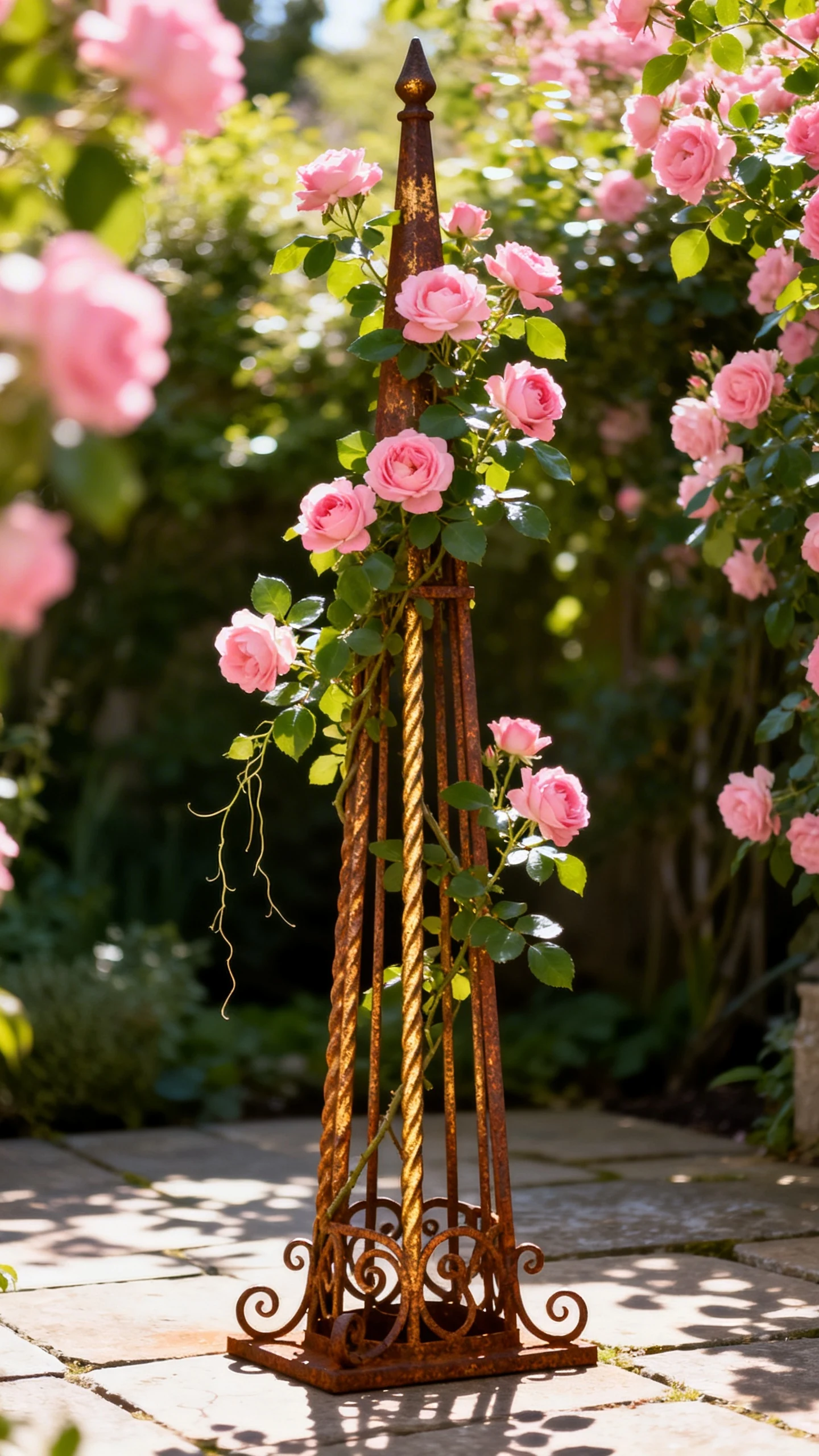 Vertical elements help more than people realize. Trellises, arches, obelisks, and climbing plants draw the eye upward and free up ground space. Even one climbing rose or clematis can add serious drama without hogging the whole bed.