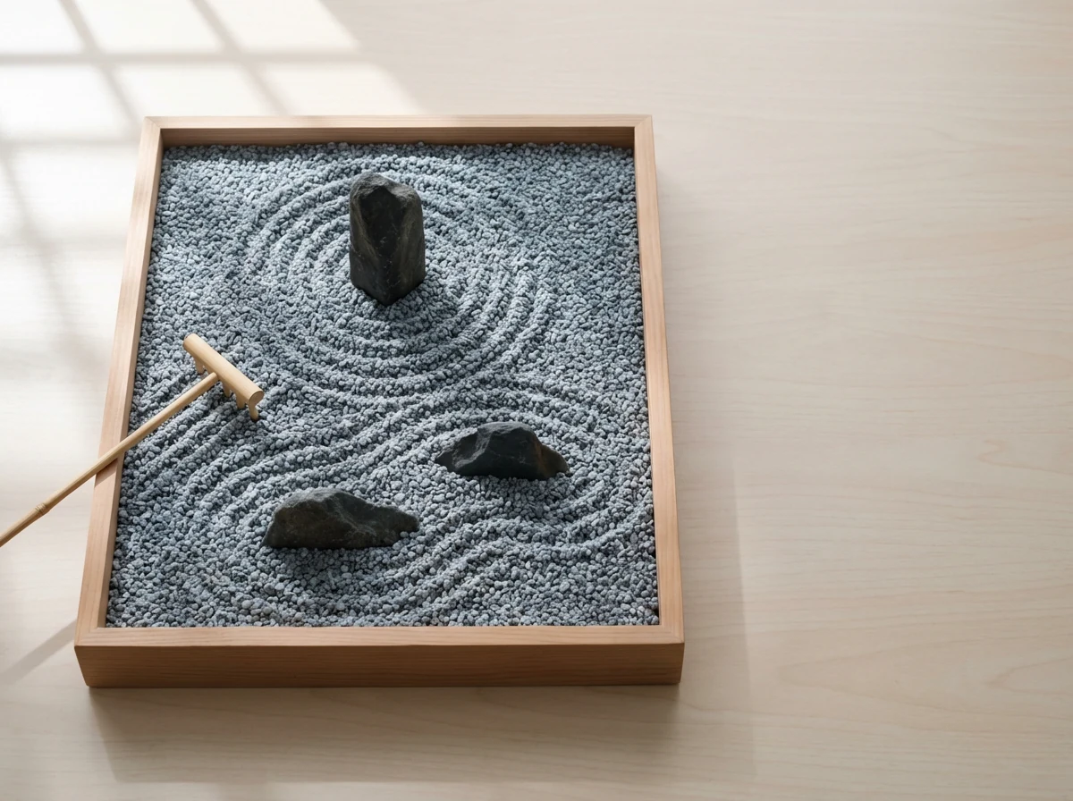 Use a shallow planter box or a custom tray with drainage holes. Line it with landscape fabric, add 2–3 inches of gravel, and set a small triad of stones off-center. Rake waves or a single path from corner to corner.