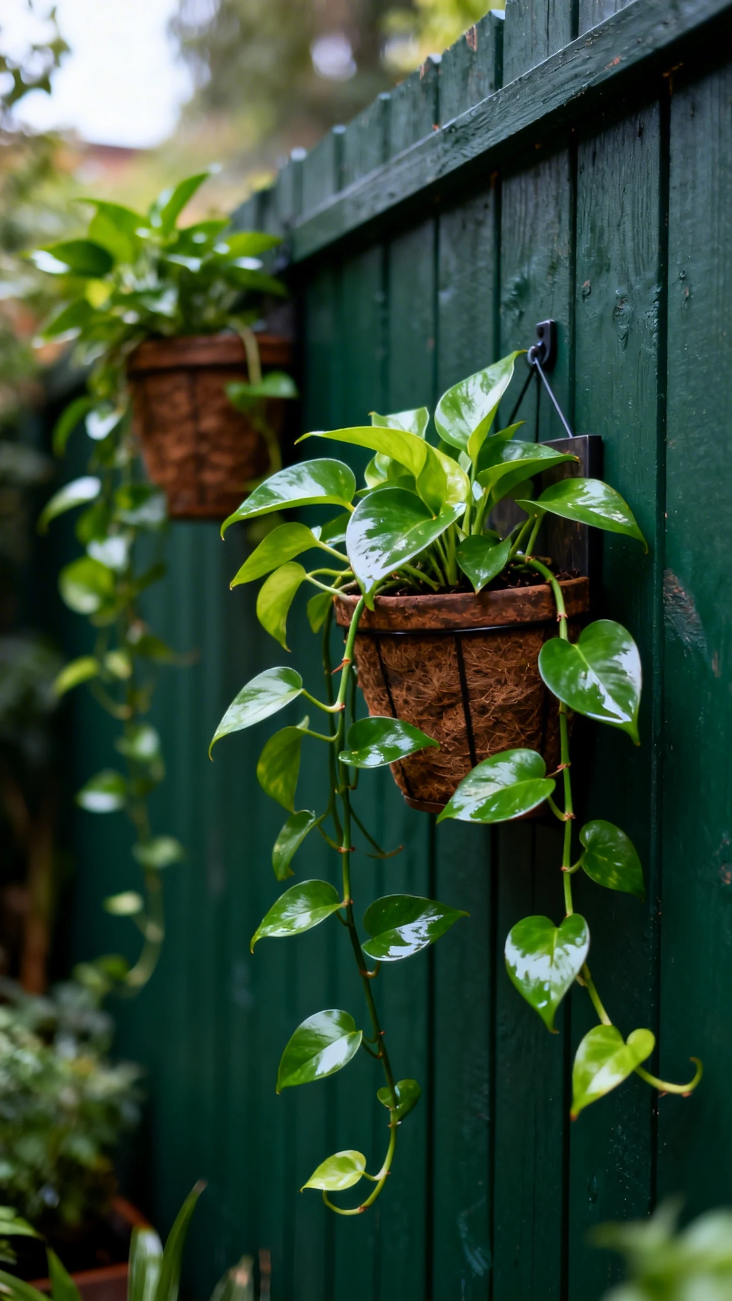 Wall-mounted shelves can hold trailing plants like pothos or philodendron. Bamboo screens and slim garden ladders also add height and texture. Plus, they help hide ugly fences, which feels like a public service.